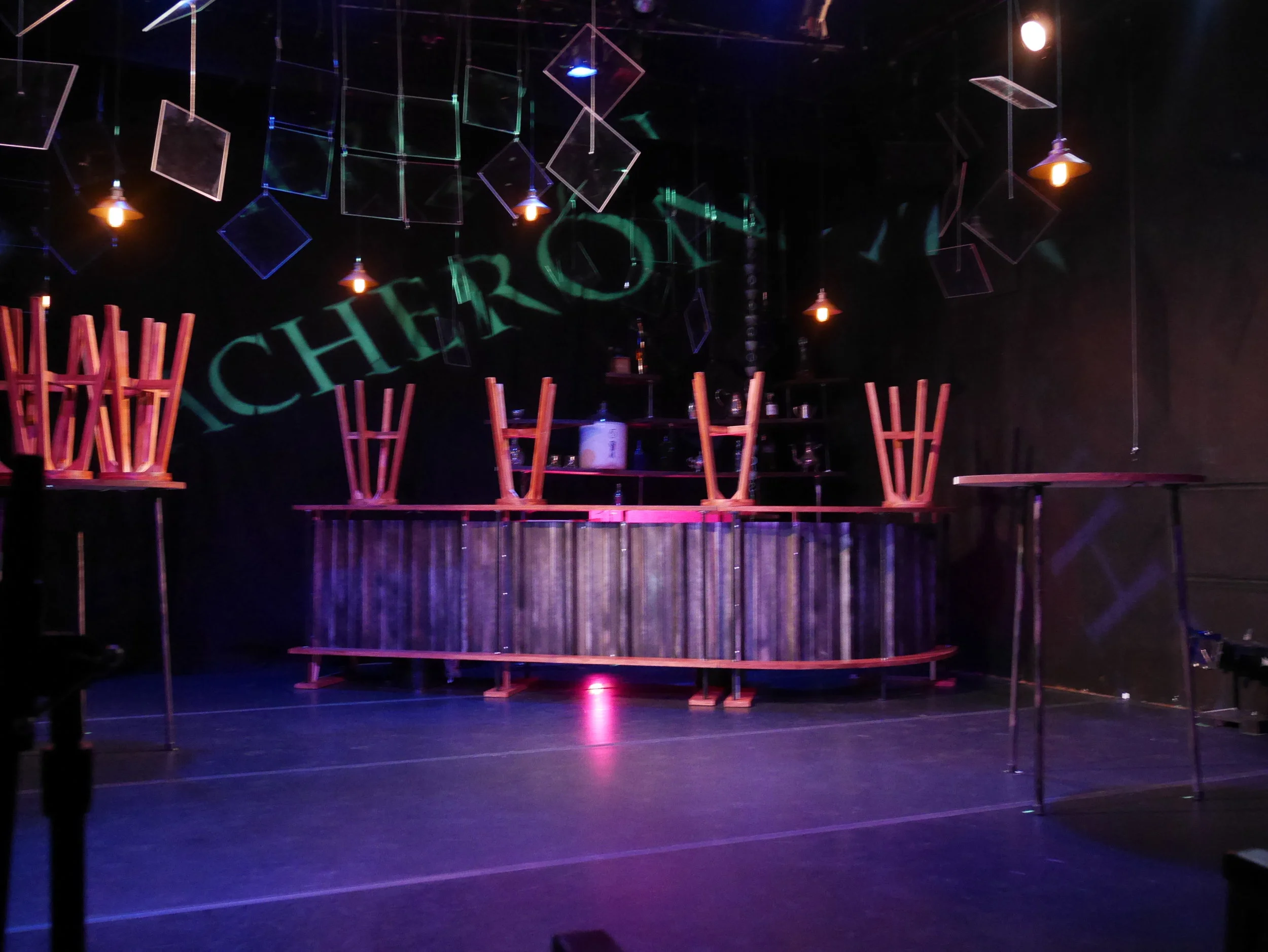 The bar where the evening unfolds is called Acheron, named for the mythological "river of pain" across which souls are ferried to the underworld. Two of these souls, each of whom has died suddenly and unexpectedly, are seated at, or, in the case of one of them, sprawled across the bar among the living mourners. The conversations that unfold around them tell of shock, pain, fear, and longing over the deaths, as well as other stories of loneliness and failed relationships.